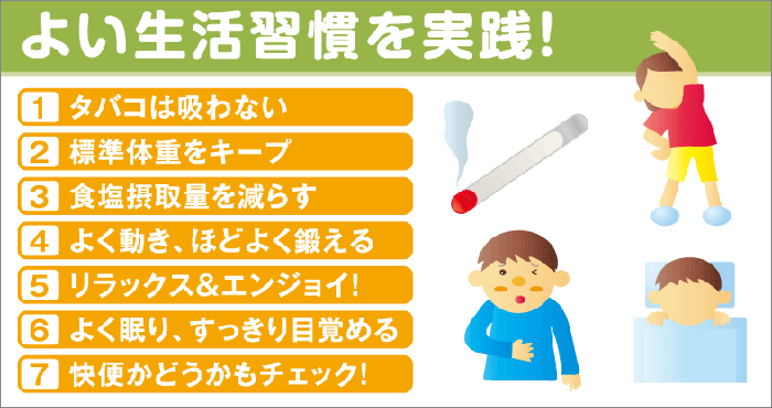 「あそこは長寿の家系だ」という様に、寿命には遺伝的なものももちろんありますが、その多くは環境因子が規定するといわれています。このため、健診の結果説明では、特定保健指導を含めて、疾患の予防、さらに健康寿命を延ばす目的で、生活習慣の指導がなされるわけです。総合判定が A・ B判定でも、改善が望ましい生活習慣について指導が入ることもあります。(下図 -参照)