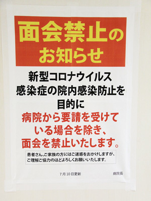 院内への感染持ち込みの予防対策として、病院より要請を受けている場合を除いては、面会と付き添いは禁止させていただいています。