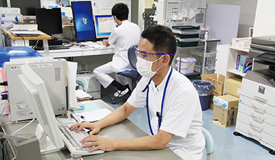 当院の職員全員には、感染の防止目的に日常生活からの12項目に亘る行動自粛を要請し、各自の健康の自己管理を指導しています。院内においては業務前の体温測定を行い、発熱者や体調不良・不安なものに対しては感染担当者が健康状態に応じた対応を計っているところです。外来職員に関しては、マスク着用を義務付けており、必要に応じたアイシールドによる自己の感染予防を行っています。