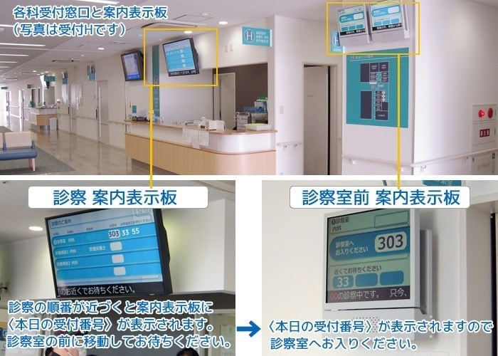 - 診察の順番が近づくと案内表示板の「診察室の前でお待ちください」の欄に「本日の受付番号」が表示されます。診察室の前に移動してお待ちください。